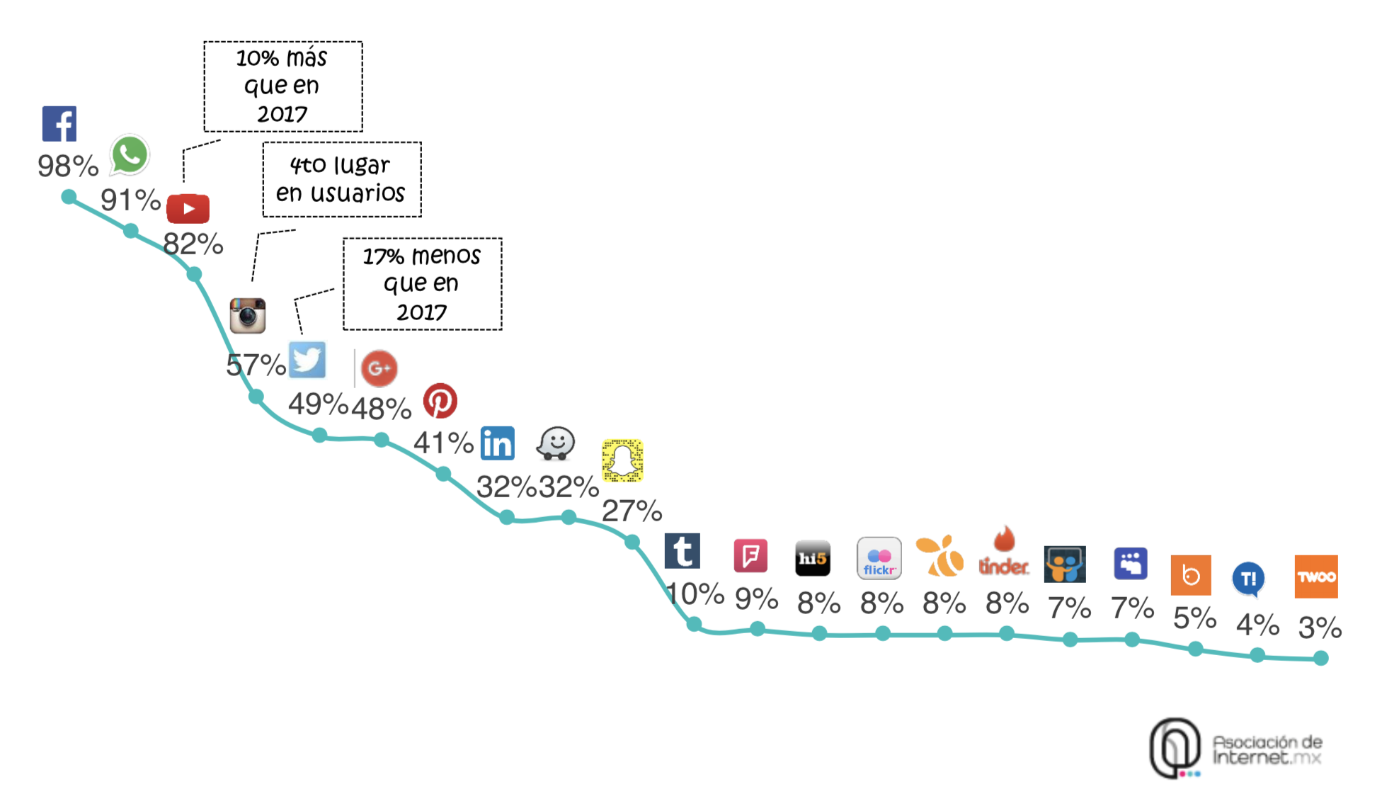 Lo interesante de esta gráfica es lo lejos que está el cuarto lugar (Instagram) de los primeros tres (Facebook, WhatsApp y YouTube).